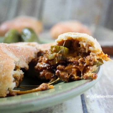 All the flavors of a cheeseburger in an easy to hold roll. Hamburger, pickles, cheese, all your favorite hamburger toppings wrapped up in a low carb dough and baked until golden brown.