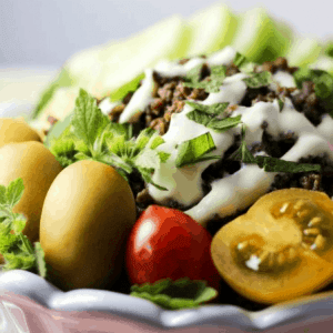 15-minute KETO Greek Bowl has amazing flavors including a Mint Cream Sauce that gets poured over the top.