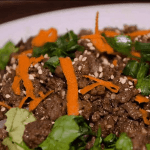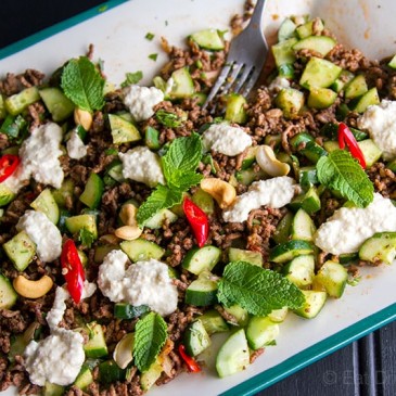 Spicy Beef & Cucumber Salad With Cashew Raita