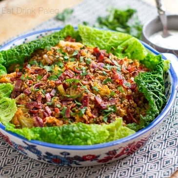 It’s a nutritious, low-carb recipe uses ground beef and bacon and can be made ahead of time and kept it in the fridge for a couple of days (it only gets better!)