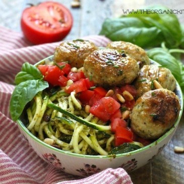 A delicious low carb meatball meal with lots of veggies and fresh pesto!