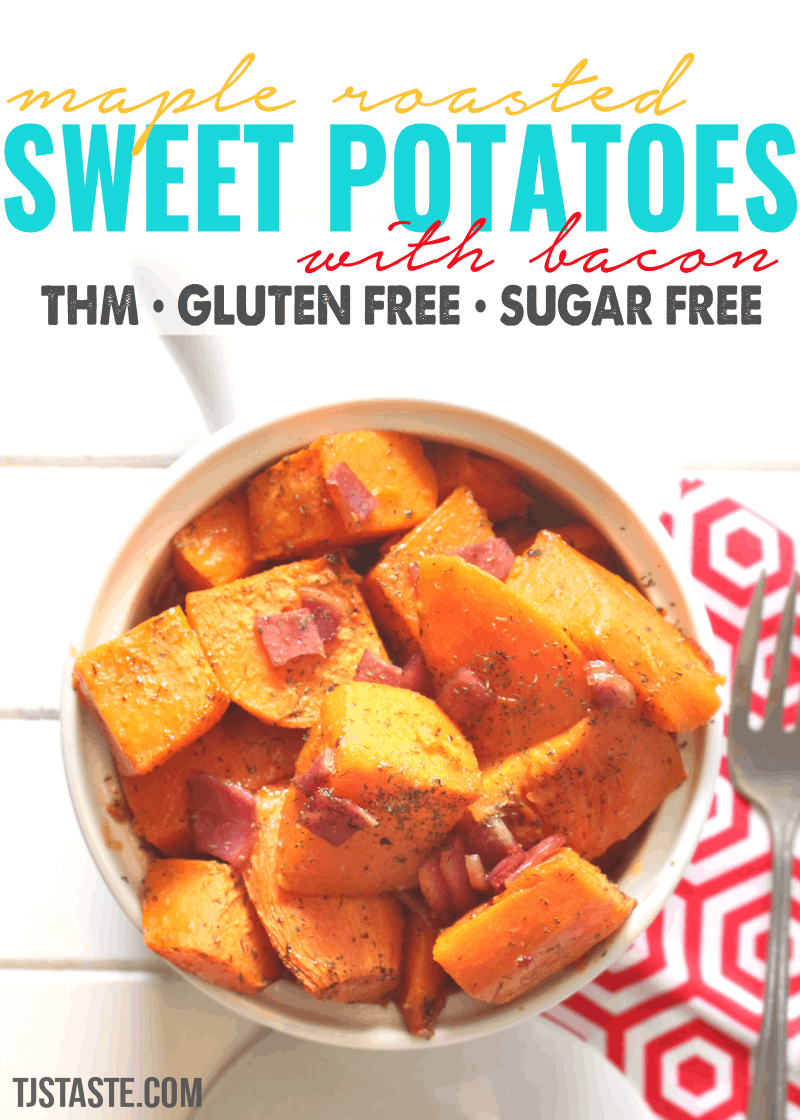 The inspiration behind this dish was the desire to have more Carbalicious (or Energizing/E if you’re following Trim Healthy Mama) side dishes. And since I love sweet potatoes when they’re roasted (my favorite is when they’re at the carmelizing point, when the edges begin to brown…SO yummy!) and the blend of bacon and maple syrup together, I decided to make something using all of the above.