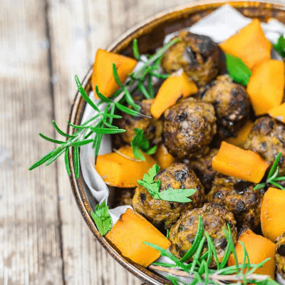 These super easy roasted keto pumpkin meatballs are not only extremely delicious but they’ll also provide you with vibrant colors and fill up your autumn kitchen with a satisfying rosemary aroma.