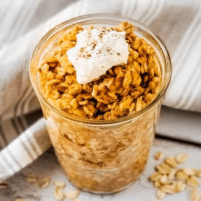 Low in fat, these easy pumpkin spice overnight oats have a hint of caramel. Eat them cold or warm them quickly if you want an easy, hot breakfast. They also make great snacks and are very portable!