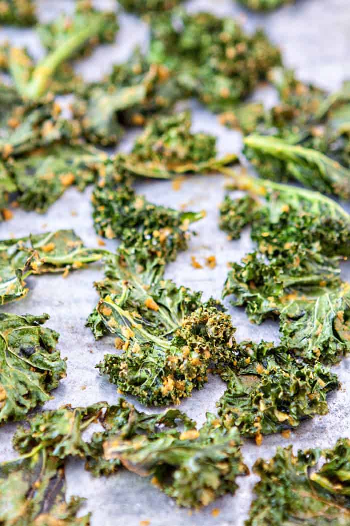 These “Cheesy” Kale Chips are a great, healthy way to satisfy your cravings for something salty and cheesy. Nutritional yeast gives them a nutrient-rich cheesy flavor without any added dairy.